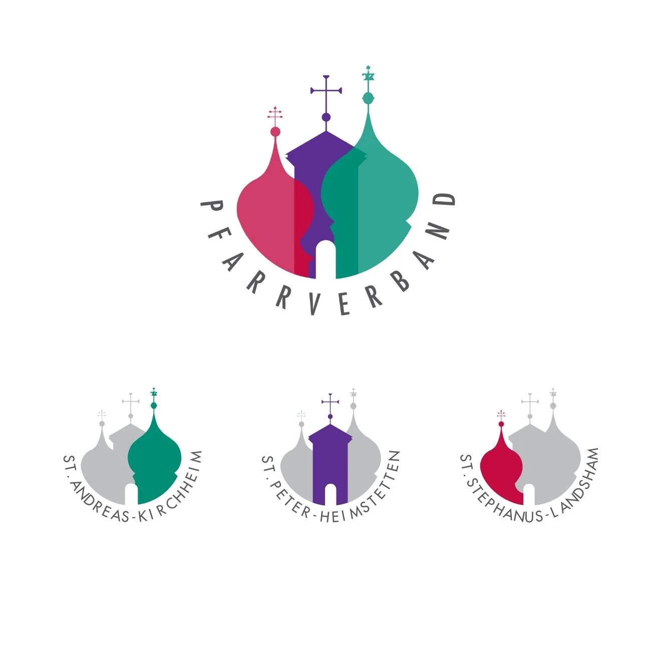 Ein verbindendes Zeichen, abgeleitet aus den Kirchtürmen, mit eigenständigen Varianten für jede Gemeinde – getragen von einer klaren formalen Logik.